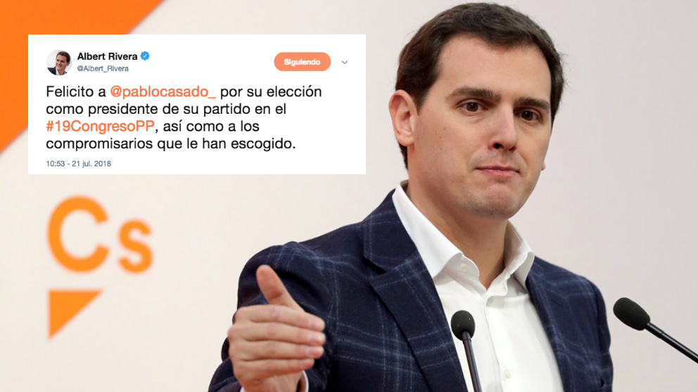 «Felicito a @pablocasado_ por su elección como presidente de su partido en el #19CongresoPP, así como a los compromisarios que le han escogido», ha escrito Rivera en su cuenta personal de Twitter.