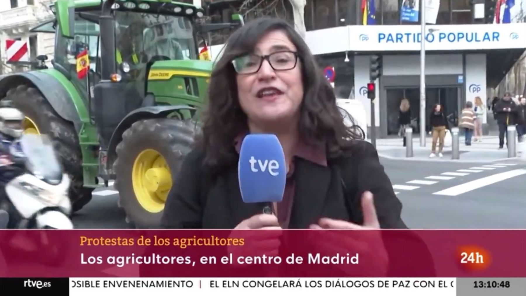 Una reportera de RTVE se ha situado frente a la sede del Partido Popular durante la cobertura informativa de las protestas de los agricultores en Madrid. Asociaciones de trabajadores de la televisión pública se han quejado de la «manipulación subliminal» que supone elegir la sede nacional del PP como fondo de la conexión. «¿Las tractoradas no eran contra la UE y el Gobierno?», se preguntaban.