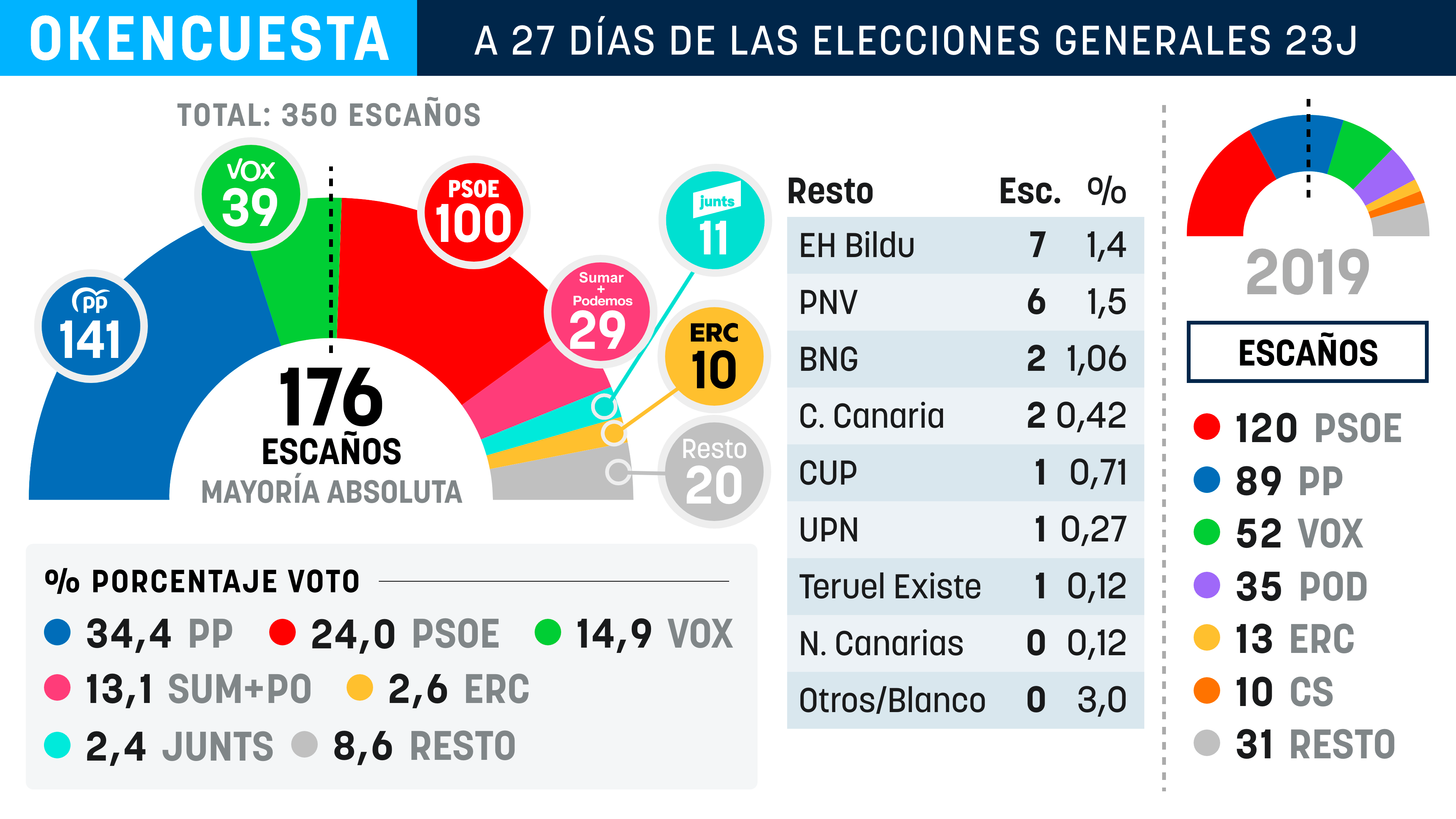 El auge del PP castiga inevitablemente a Vox, que pierde 13 escaños en comparación con 2019. Aún así, los 39 diputados (14,9% del voto) que sacaría en los próximos comicios serían todavía suficientes para firmar la mayoría absoluta de la derecha.