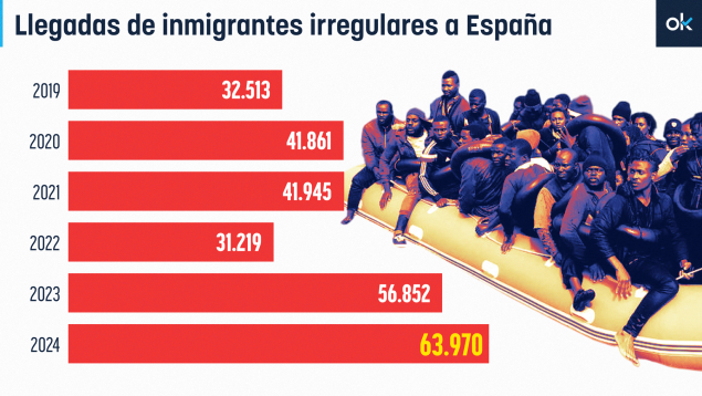 Sin embargo, todas estas ayudas no han implicado una reducción de las llegadas de inmigrantes. De hecho, el último año marcó un hito como el año completo de Sánchez con más llegadas irregulares a España. Tanto es así que las cifras de llegadas prácticamente se han duplicado desde 2019. Entonces, entraron irregularmente 32.513 personas, mientras que en 2024 lo hicieron 63.970.