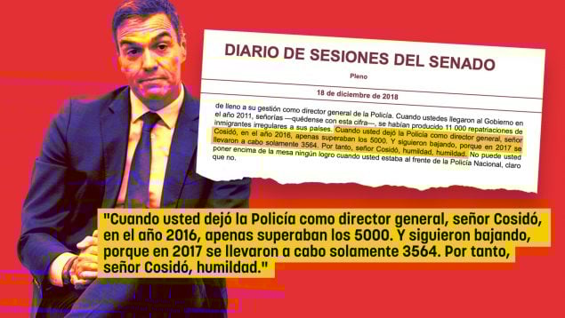 Revelador fue especialmente el momento de su intervención en el que contestaba al entonces senador Ignacio Cosidó, que durante la etapa de gobierno de Rajoy había sido director general de la Policía. Pedro Sánchez, lejos de renunciar a la expulsión de inmigrantes ilegales y de defender regularizaciones extraordinarias como la que ahora lleva a cabo, lo que hizo fue reprochar al PP que, mientras había estado gobernando Rajoy, había hecho pocas repatriaciones.