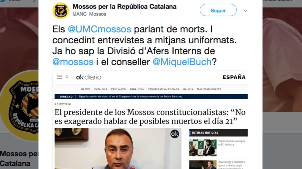 El independentismo ha hecho frente común para señalar al presidente de la Union de Mossos Constitucionalistas tras su entrevista con OKDIARIO. En sus mensajes piden a la División de Asuntos Internos y al consejero de Interior, Miquel Buch, que investiguen al mosso por alertar en la entrevista que hay riesgo de que haya muertos en la deriva violenta que el separatismo está imprimiendo al procés.