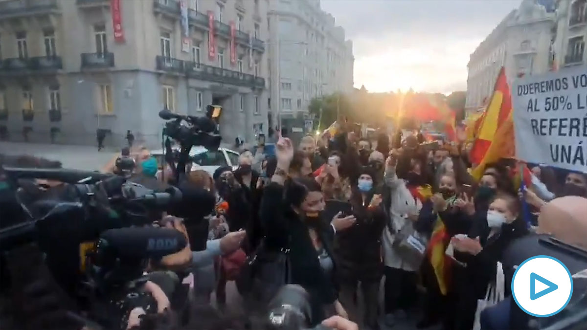 Entre gritos de «¡Abascal presidente!» y «¡Gobierno dimisión!», un grupo de entre 30 o 40 personas han ondeado banderas de España y paraguas con la enseña nacional al mismo tiempo que lanzaban consignas contra los proetarras de Bildu y a favor de los Cuerpos y Fuerzas de Seguridad del Estado. Minutos antes de que diera comienzo la sesión en el hemiciclo, la secretaria general de Vox, Macarena Olona, se ha acercado a agradecerles su apoyo.