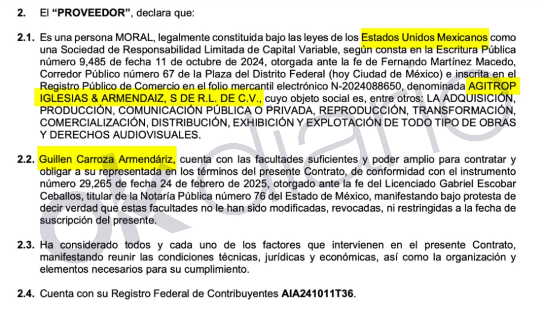 Esta empresa constituida en México el pasado octubre se dedica al sector de la comunicación y la publicidad, siendo contratista de instituciones como el propio Ejecutivo de Sheinbaum o el Estado mexicano de Oaxaca, cuyo gobernador es Salomón Jara, muy próximo al ex presidente Andrés Manuel López Obrador. El propio Carroza Armendáriz aparece como «representante legal» de la sociedad en estos contratos.