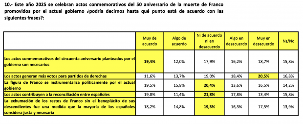 La encuesta de DATA10 no sólo mide opiniones: retrata una desconexión profunda entre la agenda simbólica del Gobierno y las prioridades reales de los españoles. Y los datos son contundentes: los actos del 50 aniversario de Franco no son una demanda social, sino una iniciativa que apenas convence a una minoría.