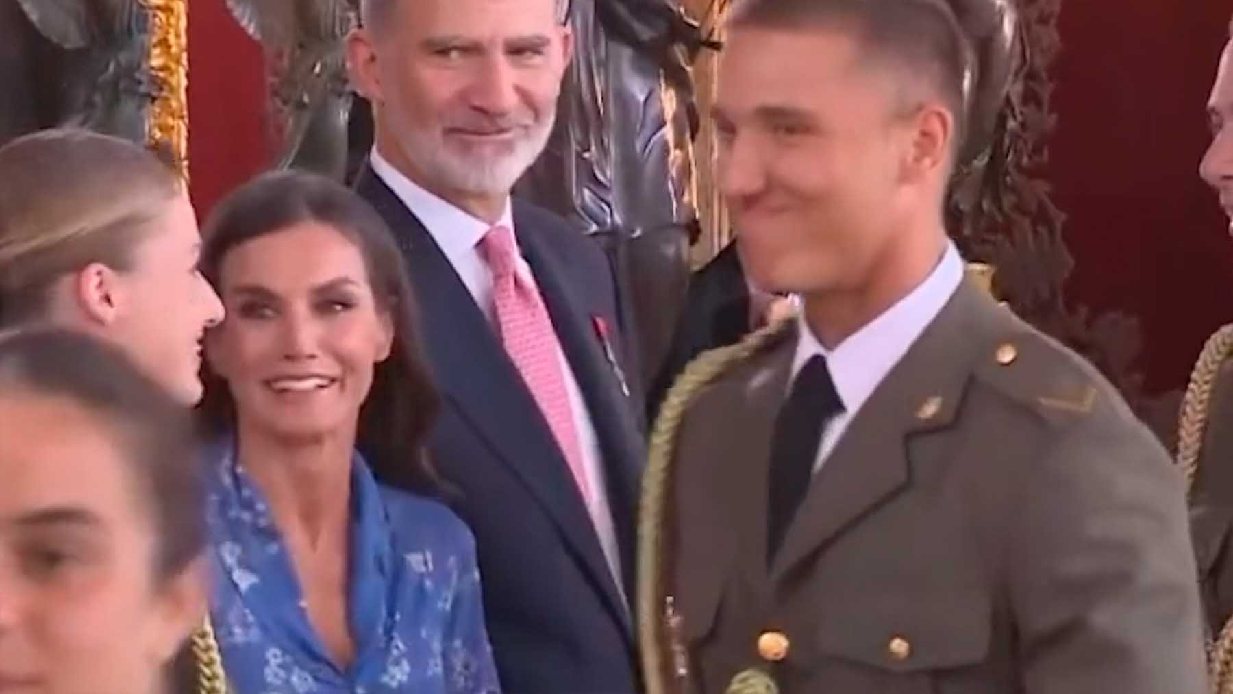 La secuencia es la siguiente: los cadetes, uno tras otro, se acercan para saludar a los Reyes y a la princesa pero, de repente, aparece una sonrisa mayor a la habitual en los rostros de Felipe VI, Letizia y Leonor. Llega uno de los militares y mientras saluda todos se ríen, él también y hace un gesto de nerviosismo. Es más, el Rey busca la mirada a su hija que se gira para volver a mirar a su compañero.