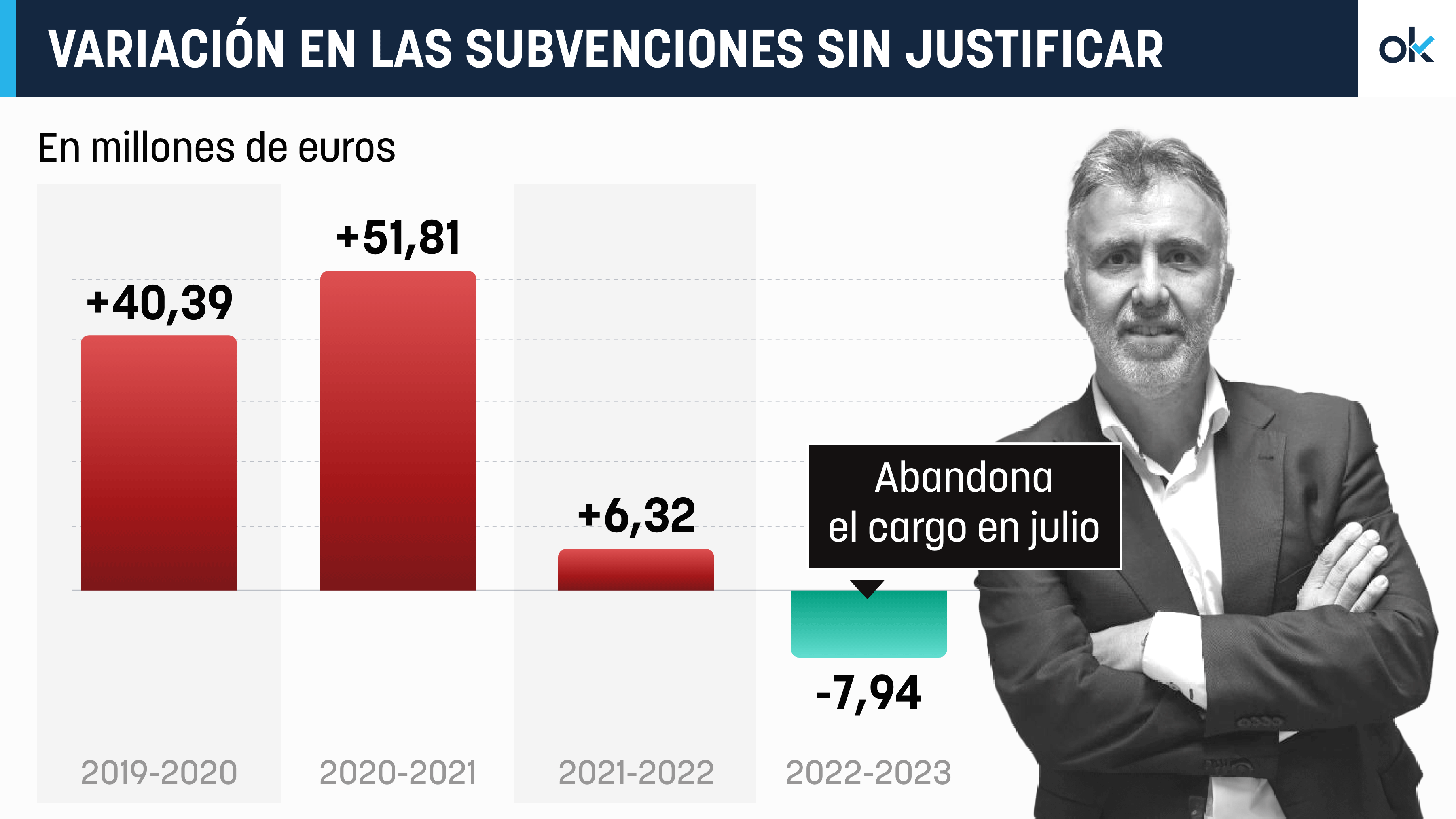 Las subvenciones sin justificar otorgadas por el Gobierno de Canarias se han reducido en ocho millones de euros en el mismo año en el que Ángel Víctor Torres dejó la presidencia y se convirtió en ministro de Política Territorial y Memoria Democrática en el Ejecutivo central de Pedro Sánchez. Se trata de la primera vez en cuatro años que se recorta el agujero de ayudas pendientes de justificar. Y es que, durante el mandato del dirigente socialista, estos gastos crecieron en casi 100 millones de euros.