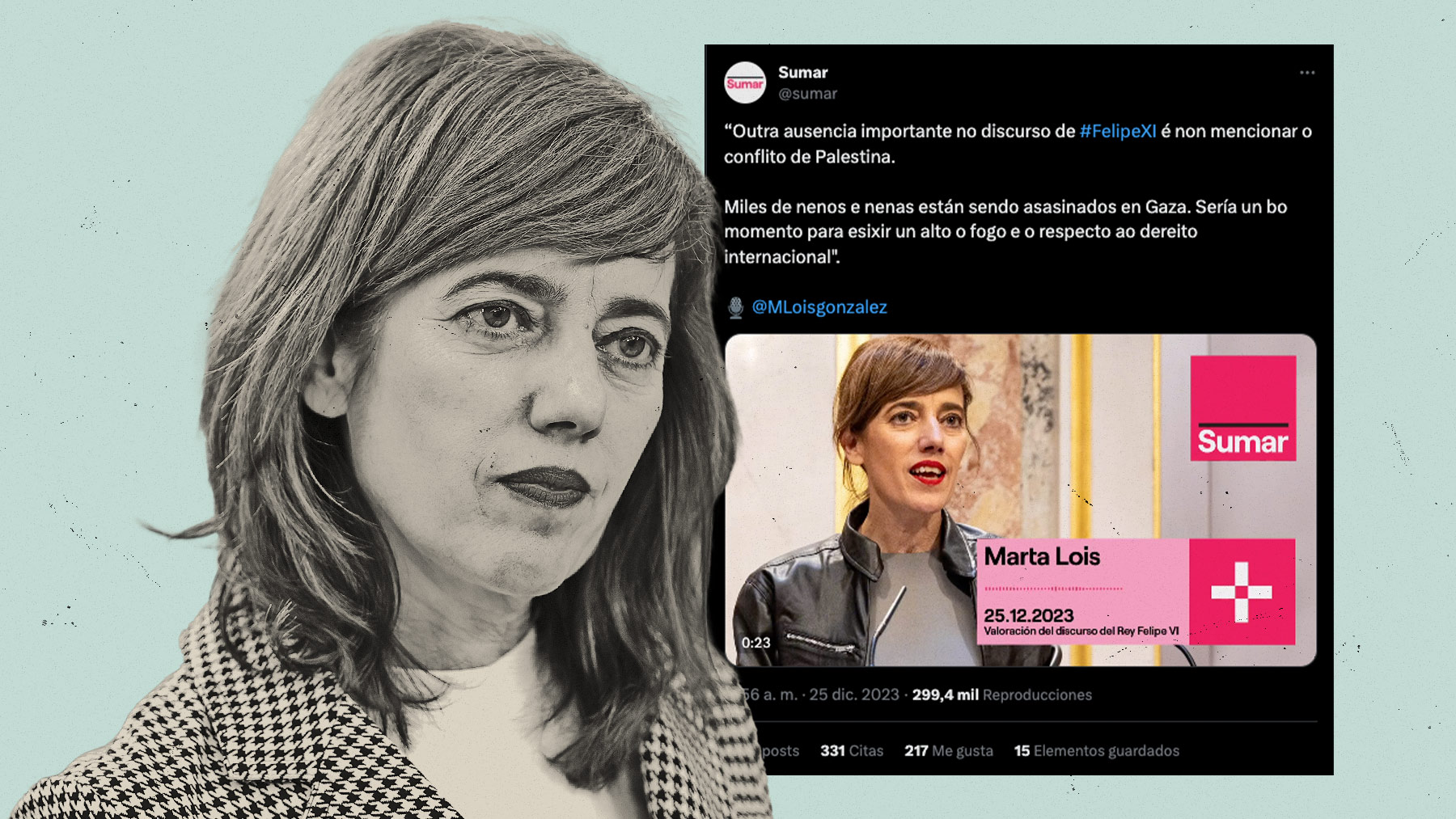 En este sentido, Marta Lois, amortizada ya por Yolanda Díaz al ser la candidata del partido rosado en las próximas elecciones gallegas, ha intentado afear al Rey su falta de menciones a la importancia de respetar el derecho internacional, precisamente días después de que se diese luz verde en el Consejo de Seguridad de Naciones Unidas una resolución presentada por las naciones árabes en la que se aprobaba la entrada de ayuda humanitaria, demostrando su desconocimiento sobre la cuestión. Unas palabras que han destacado después de la crisis entre España e Israel provocada por Pedro Sánchez tras sus amenazas al primer ministro Benjamin Netanyahu durante un viaje en el que intentó aprovechar Sánchez la masacre de Hamás para elevar su perfil internacional. A este comentario se añade que Sira Rego, ministra de Juventud e Infancia, de Sumar, haya justificado la masacre de Hamás.