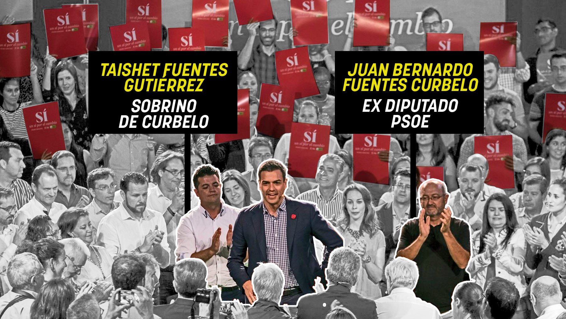 En la imagen de aquel encuentro de los socialistas canarios, el entonces líder del PSOE y de la oposición aparece flanqueado por los dos políticos socialistas implicados en la trama: Fuentes Curbelo, a la derecha, y Taishet Fuentes (Tai) a la izquierda. Aquel mitin giró en torno a la corrupción, con frases de Sánchez como «yo soy un político en A”, mientras que “Rajoy es un político en B, porque lo tiene todo en B: el programa electoral, la financiación, la contabilidad…”