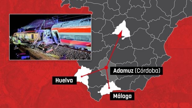 El accidente se ha producido este domingo 18 de enero a las 19:50 horas y, según han confirmado fuentes ferroviarias, el primer convoy afectado fue el tren LD AV Iryo 6189, que realizaba el trayecto María Zambrano (Málaga)–Puerta de Atocha (Madrid). El tren descarriló en los desvíos de entrada de la vía 1 de Adamuz, lo que provocó que varios de sus coches invadieran la vía contigua. En el tren de Málaga iban al menos 300 pasajeros.