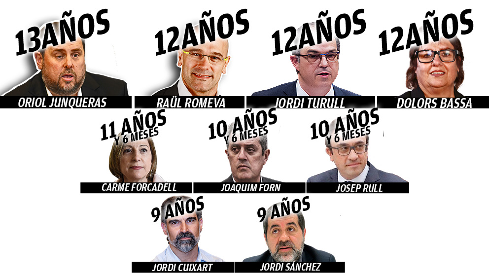 Los 12 condenados por el Tribunal Supremo por su implicación en el proceso separatista han recibido diferentes penas de cárcel o sanciones. De ellos, nueve han sido sentenciados con penas de hasta 13 años de cárcel (Oriol Junqueras, Carme Forcadell, Josep Rull, Jordi Turull, Raúl Romeva, Joaquim Forn, Dolors Bassa, Jordi Sánchez y Jordi Cuixart), mientras que los tres restantes (Santi Vila, Carles Mundó y Meritxell Borràs) únicamente han sido sancionados por desobediencia, puesto que, según el Alto Tribunal, no incurrieron en malversación. Aquí las penas y sanciones dictadas contra los 12 condenados: