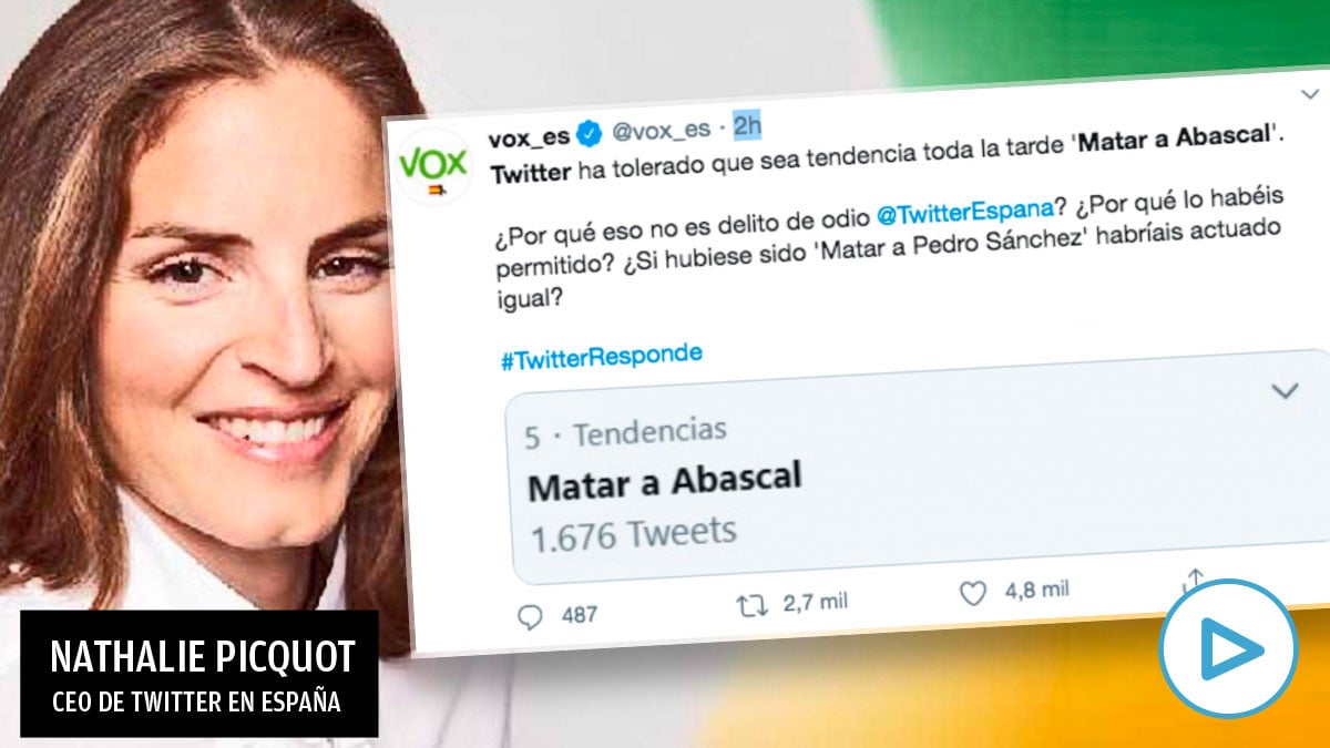 Vox ha denunciado este sábado que Twitter ha permitido que la frase «Matar a Abascal» fuera tendencia en España durante varias horas, sin cerrar la cuenta sus impulsores: «Twitter ha tolerado que sea tendencia toda la tarde ‘Matar a Abascal’. ¿Por qué eso no es delito de odio, @TwitterEspana? ¿Por qué lo habéis permitido? ¿Si hubiese sido ‘Matar a Pedro Sánchez’ habríais actuado igual?»