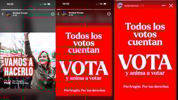 Según ha podido confirmar OKDIARIO, el alcalde socialista difundió en su perfil público de Instagram, durante la mañana del sábado 8 de febrero, varias publicaciones de claro contenido electoral. Las capturas de pantalla aportadas por Vox muestran imágenes con los lemas de campaña del PSOE «Vamos a hacerlo», «Por Aragón», «Por tus derechos» y «Todos tus votos cuentan», así como una fotografía de la candidata socialista Pilar Alegría. Todo ello con los colores corporativos del partido y en un formato inequívocamente propagandístico.