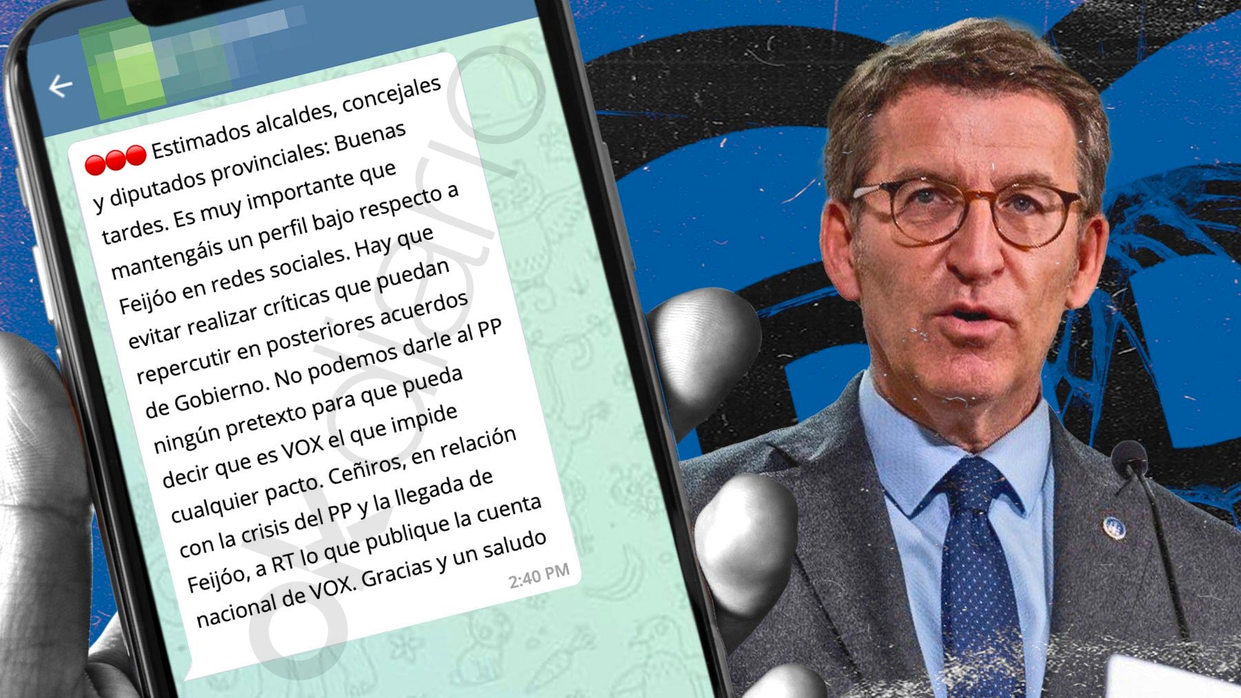 «Estimados alcaldes, concejales y diputados provinciales: Buenas tardes. Es muy importante que mantengáis un perfil bajo respecto a Feijóo en redes sociales. Hay que evitar realizar críticas que puedan repercutir en posteriores acuerdos de Gobierno. No podemos darle al PP ningún pretexto para que pueda decir que es Vox el que impide cualquier pacto. Ceñiros, en relación con la crisis del PP y la llegada de Feijóo, a RT lo que publique la cuenta nacional de Vox. Gracias y un saludo», es el mensaje que han recibido los cargos provinciales de Vox a través de los canales habituales de comunicación interna.