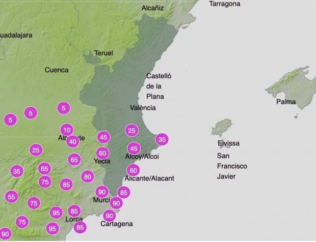 Así que la probabilidad de precipitación rondará el 90% en el sur de la provincia de Alicante durante las primeras horas del día y en la capital será de un 60%, lo mismo que en el interior. Por lo que respecta a las temperaturas, las máximas serán de 24 ºC en la zona durante este martes 28 de abril.