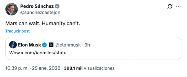 Unas siete horas y media después (se lo ha pensado el equipo monclovita) Pedro Sánchez ha respondido a Elon Musk con otro tuit donde, en inglés, le lanza un mensaje, entre apocalíptico y megalómano: «Marte puede esperar. La humanidad no».