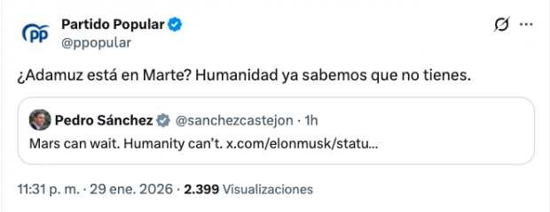 El zasca del PP a Pedro Sánchez por pasarse de listo con Elon Musk: «¿Adamuz está en Marte?»