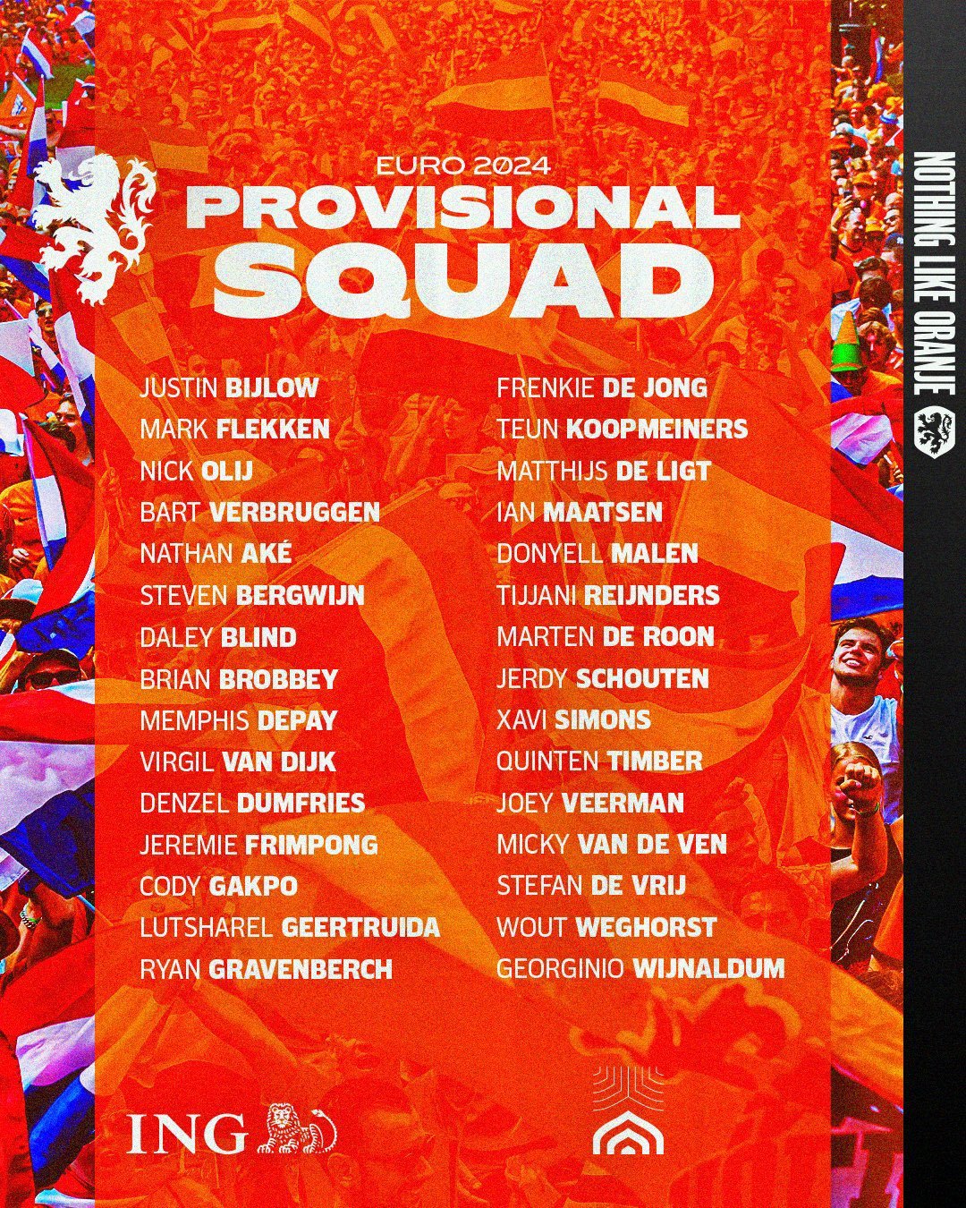- Defensas: Nathan Aké, Denzel Dumfries, Lutsharel Geertruida, Matthijs de Ligt, Daley Blind, Ian Maatsen, Jeremie Frimpong, Micky van de Ven, Stefan de Vrij y Virgil van Dijk.