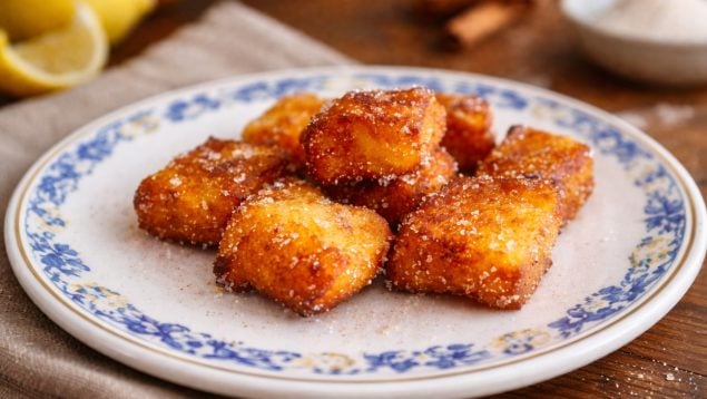 Cada pieza se reboza primero en harina y después en huevo antes de freírse en aceite caliente. El resultado es un postre con una textura muy característica: crujiente por fuera y suave por dentro.