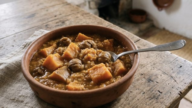 La calabaza con castañas se puede preparar como puré o como guiso. La diferencia está en el acabado final, pero el proceso de cocción es prácticamente el mismo y sigue la lógica de aprovechamiento que marcó su origen.