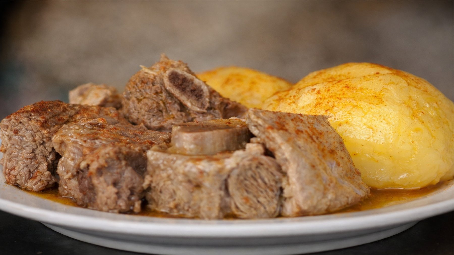 A partir de ahí, los otros elementos van adquiriendo sabor. Con el agua de cocción se hace un caldo rico y muy gelatinoso, que impregna tanto la carne como las patatas. Un plato muy humilde, pero que deslumbra por la intensidad.