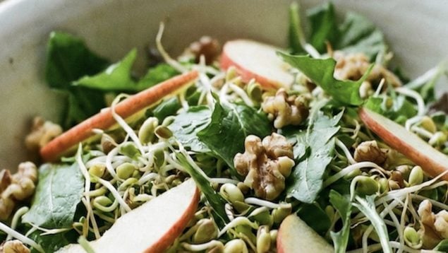 - Coloca las hojas en un cuenco, añade la manzana y reparte las nueces por encima. Aliña con aceite de oliva, una pizca de sal y unas gotas de vinagre o limón. Mezcla justo antes de servir.