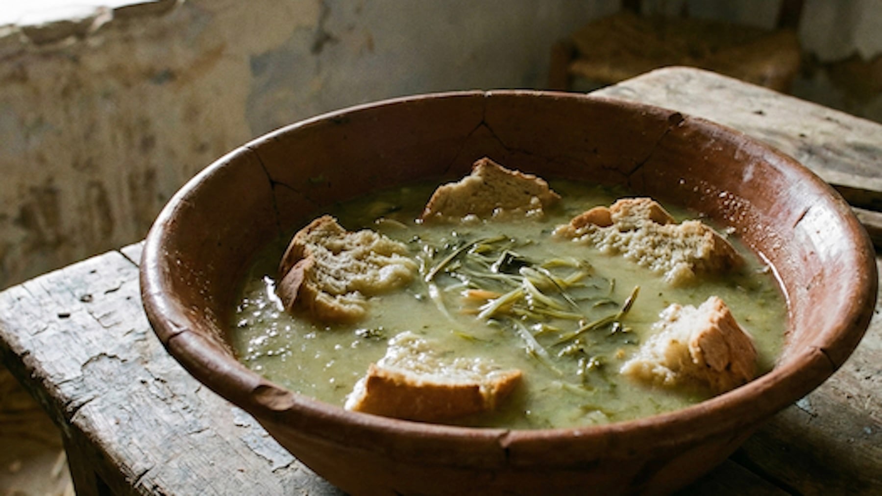 Este gazpacho no se parecía al andaluz que ahora asociamos al verano. No llevaba tomate rojo ni pepino fresco. Tenía un tono verdoso, más apagado, y una textura ligera, casi de sopa clara. Aun así, refrescaba y engañaba al hambre durante unas horas.