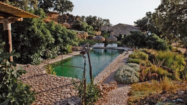 Piscina de agua de manantial. Jardín medicinal con 350 especies botánicas. Centro ecuestre con burros y caballos lusitanos. Granja y huerto orgánicos que sostienen la cocina.