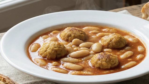 El guiso es sencillo, las habichuelas se cuecen con verduras básicas y un fondo aromático tradicional. Aparte se preparan unas albóndigas de bacalao que sustituyen a la carne y aportan consistencia al plato. El resultado es un potaje espeso, de cuchara, pensado para servir caliente y como plato único.