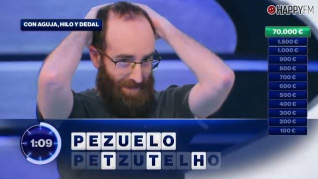 El tema era «Con aguja, hilo y dedal». Diego Aguado comenzó, poco a poco, a resolver las palabras ocultas, entre las que se encontraban «modistilla», «costurera» o «hilandera». Tras responder «bordadora», tan solo le quedaba una palabra por adivinar. Por suerte, había conseguido la ansiada llave al principio del programa, por lo que la utilizó y se desveló que era «pezuelo».