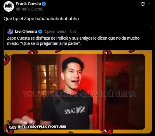 El corte de este momento ha sido compartido en redes sociales por el youtuber Javi Oliveira, por lo que Frank ha querido aprovecharlo para contestar a su propio hijo ante esta broma. «Que hp el Zape hahahahahahahahha», era su respuesta ante lo que había visto.