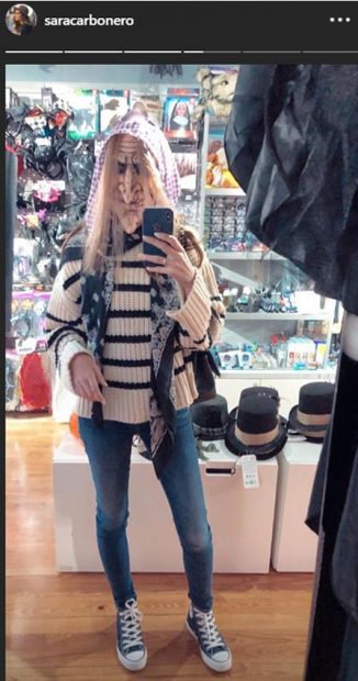 Como se puede ver en la imagen que Sara Carbonero publicó en la historia de su Instagram, ya se ha probado algunas cosas que podrían ser pistas de su disfraz de este año, por ejemplo la máscara terrorífica con la que aparece en la imagen.