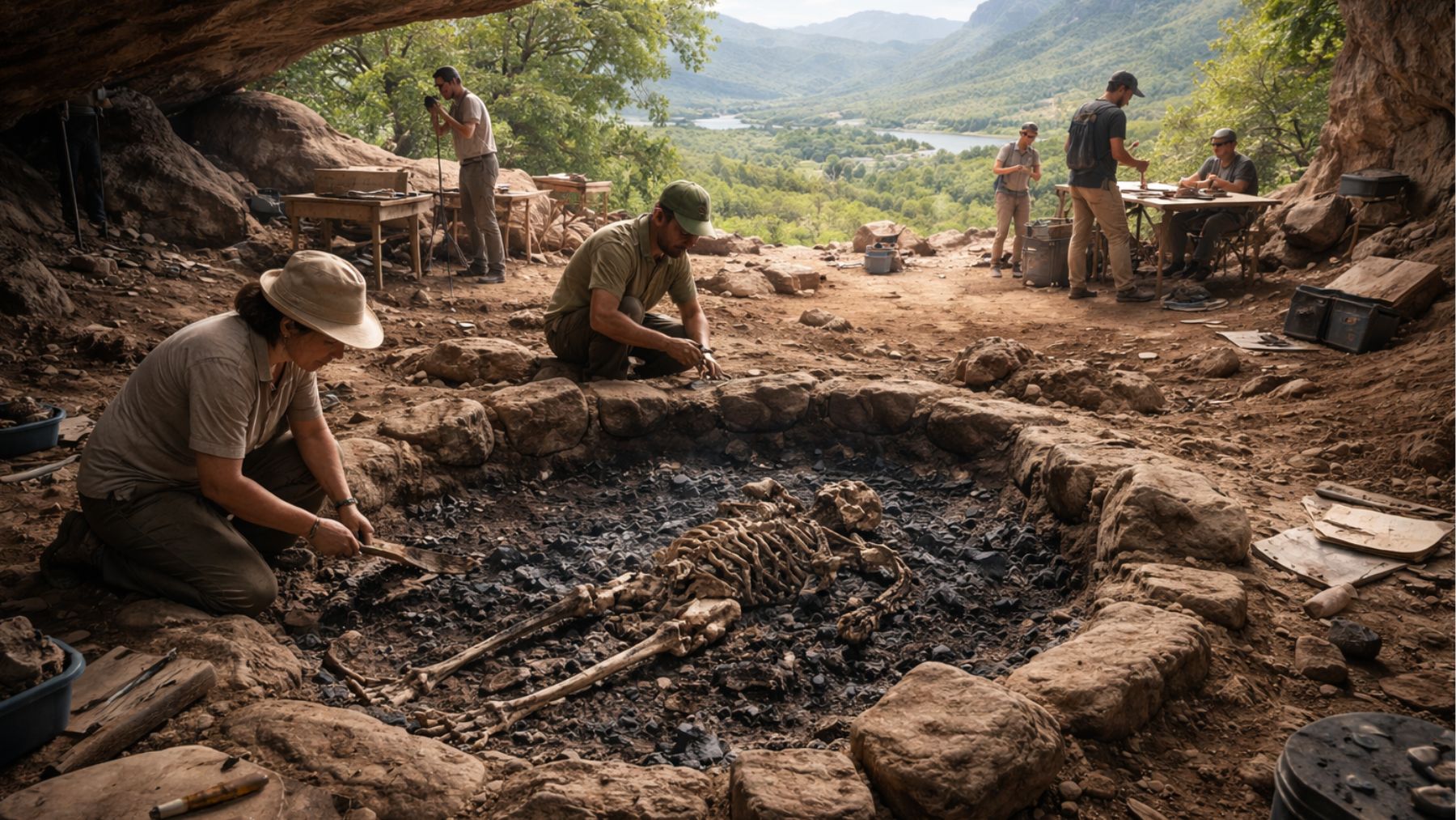 El abrigo rocoso de Hora 1, situado al pie del monte Hora, ha sido el escenario de este hallazgo excepcional. En este enclave, los arqueólogos localizaron restos calcinados de una mujer adulta en lo que se interpreta como una cremación deliberada.