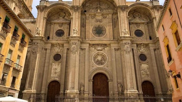 Si te colocas frente a la entrada principal, es difícil no fijarse en la fachada. Es obra de Alonso Cano y tiene un estilo claramente barroco. Es muy distinta del resto del edificio, más decorada, más expresiva. No está ahí solo para impresionar, también transmite un mensaje. Los relieves y esculturas representan escenas y símbolos religiosos que refuerzan la idea del triunfo del cristianismo tras la conquista.