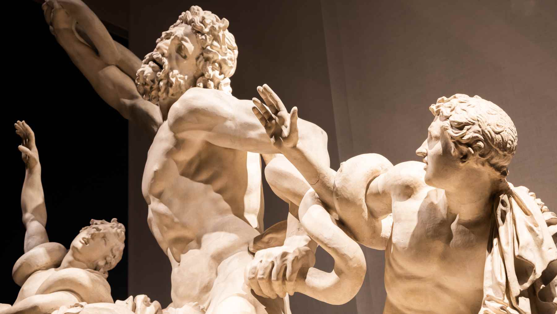 La expresión es muy intensa, pero también mantiene cierta dignidad. Sus hijos también muestran desesperación. Uno de ellos parece todavía tener alguna posibilidad de escapar, mientras que el otro parece estar ya casi derrotado. Las serpientes no solo son parte de la historia. También ayuda a crear movimiento visual en la escultura, guiando la mirada del espectador por toda la escena.
