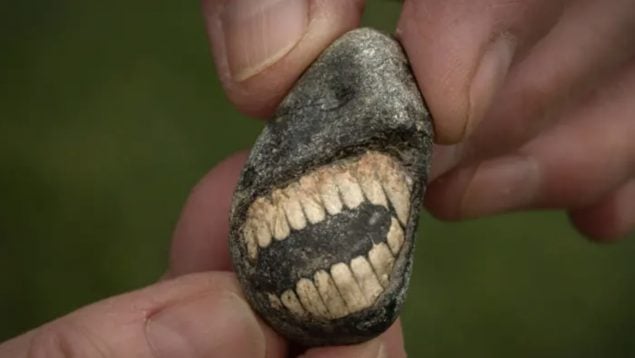 Christine Clark caminaba por la playa de la isla de Lindisfarne, en el condado de Northumberland, cuando vio una pequeña piedra. La forma del fósil le llamó la atención de inmediato. Clark explicó que el fragmento «parecía una dentadura postiza» y que incluso tuvo la sensación de que la roca le estaba sonriendo.