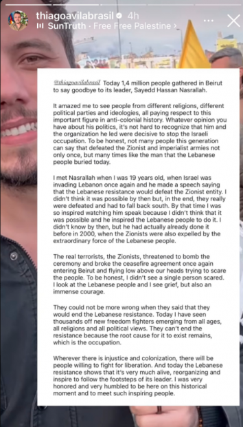 A través de sus redes sociales, Ávila, explicó que 1,4 millones de personas se habían reunido en Beirut para despedir al líder terrorista. Un homenaje que emocionó al activista brasileño que relató el asombro que le supuso «ver a personas de diferentes religiones, partidos políticos e ideologías, rindiendo homenaje a esta importante figura en la historia anticolonial».