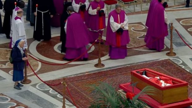 Geneviève Jeanningros ha sido la protagonista este miércoles. Es una monja francesa de 81 años, era amiga del Papa Francisco, quien la apodaba con cariño la enfant terrible. La religiosa pertenece a las Hermanitas de Jesús. Sor Geneviève ha roto el protocolo al no esperar su turno después de los cardenales, obispos y personal del Vaticano, que deben ser los primeros en despedir al Papa en la Basílica de San Pedro. Como se puede ver en la imagen, Geneviève Jeanningros se ha quedado frente al féretro para despedirse del Santo Padre.