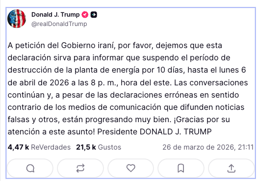 «A petición del Gobierno iraní, por la presente declaro que voy a aplazar diez días el plazo para la destrucción de centrales energéticas, hasta el lunes 6 de abril de 2026 a las 20.00 horas, hora del Este (2.00 de la madrugada en la España peninsular)», en el mensaje que ha publicado.