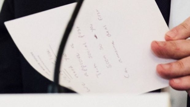 Donald Trump era interrumpido por el Secretario de Estado, Marco Rubio, que le ha pasado la nota y le ha susurrado un mensaje al oído. Trump informaba entonces a la sala que lo que le había dicho, que estaba relacionado con su plan de paz para la Franja de Gaza. «Acabo de recibir una nota del Secretario de Estado que dice que estamos muy cerca de un acuerdo en Oriente Medio y que será necesario hacerlo con bastante rapidez», ha dicho Trump.