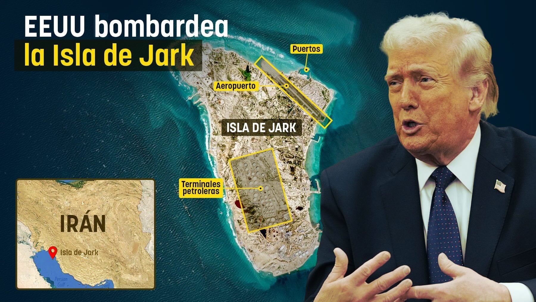 El presidente de Estados Unidos Donald Trump ha anunciado este viernes que Estados Unidos ha realizado un potente bombardeo contra objetivos militares iraníes en la isla de Jark, uno de los puntos estratégicos más importantes del país en el Golfo Pérsico. Según ha explicado Trump en un mensaje publicado en la red social Truth Social, el ataque habría destruido «por completo» todos los objetivos militares identificados en la zona. Antes de la guerra de Israel y Estados Unidos contra la dictadura de los ayatolás de Irán, cerca de 1,6 millones de barriles salían a diario de la isla. Dispone de una red de oleoductos que van a los mayores yacimientos de Irán. Así Trump ha arrasado objetivos militares en la isla iraní petrolera de Jark y ha advertido: «Puedo destruir su petróleo» si los ayatolás amenazan el Estrecho de Ormuz.