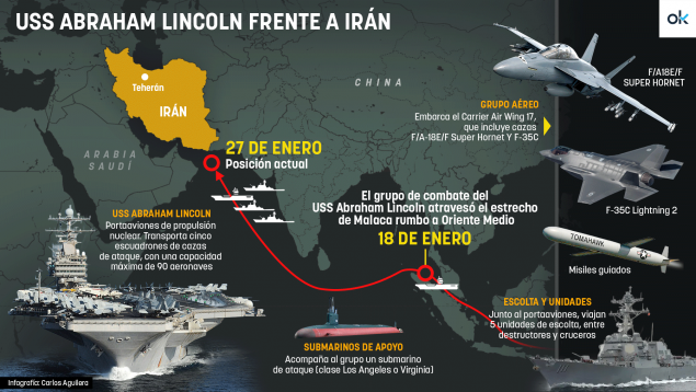 El presidente de Estados Unidos Donald Trump ha desplegado el portaaviones nuclear USS Abraham Lincoln y un potente grupo de combate en el Mar Arábigo, dejando a decenas de objetivos iraníes al alcance de la aviación estadounidense. Trump ha lanzado un ultimátum claro, aunque no se ha ordenado un ataque: quiere que los ayatolás detengan el programa nuclear y cesen la represión de los manifestantes antigubernamentales. El régimen de los ayatolás han reconocido que hay alrededor de 3.100 fallecidos, muchos de ellos menores, pero estas cifras suelen ser consideradas subestimaciones por observadores internacionales.