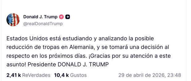 Escueto, claro y conciso. Trump ha añadido en su mensaje que «se tomará una decisión en los próximos días» sobre la retirada de parte de las tropas estadounidenses en Alemania. Todo lo contrario a lo que esperaba Merz, que en la mañana de este miércoles había asegurado que su relación con Trump sigue siendo buena a pesar de las críticas que ambos mandatarios se han intercambiado con motivo de la guerra contra Irán.