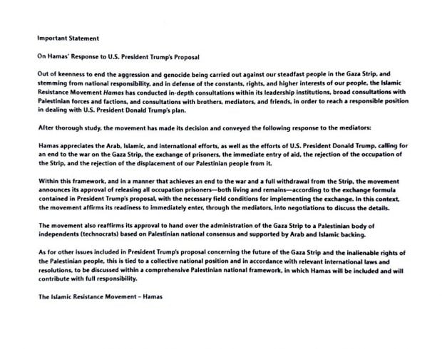 Hamás dice que liberaría a todos los rehenes, vivos y muertos, «según la fórmula de intercambio descrita en la propuesta del presidente Trump, siempre que se garanticen las condiciones de campo necesarias para el intercambio». Miembros de Hamás declararon posteriormente a Al Jazzera que su liberación probablemente tardaría más de las 72 horas estipuladas en la propuesta estadounidense.
