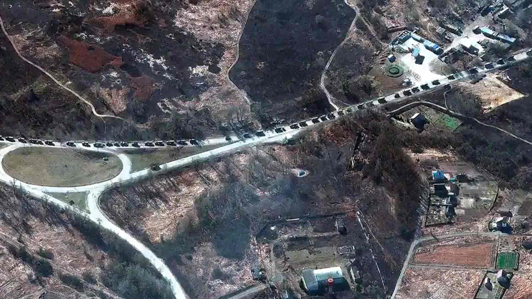 Camino de la capital de Ucrania se dibuja una descomunal -¡67 kilómetros!- fila de carros blindados y camiones con militares que conforman el grueso del equipo enviado por Putin para tratar de tomar de una vez por todas el control de Kiev. Se trata del convoy que se observa en la imagen que ilustra esta crónica tomada vía satélite.