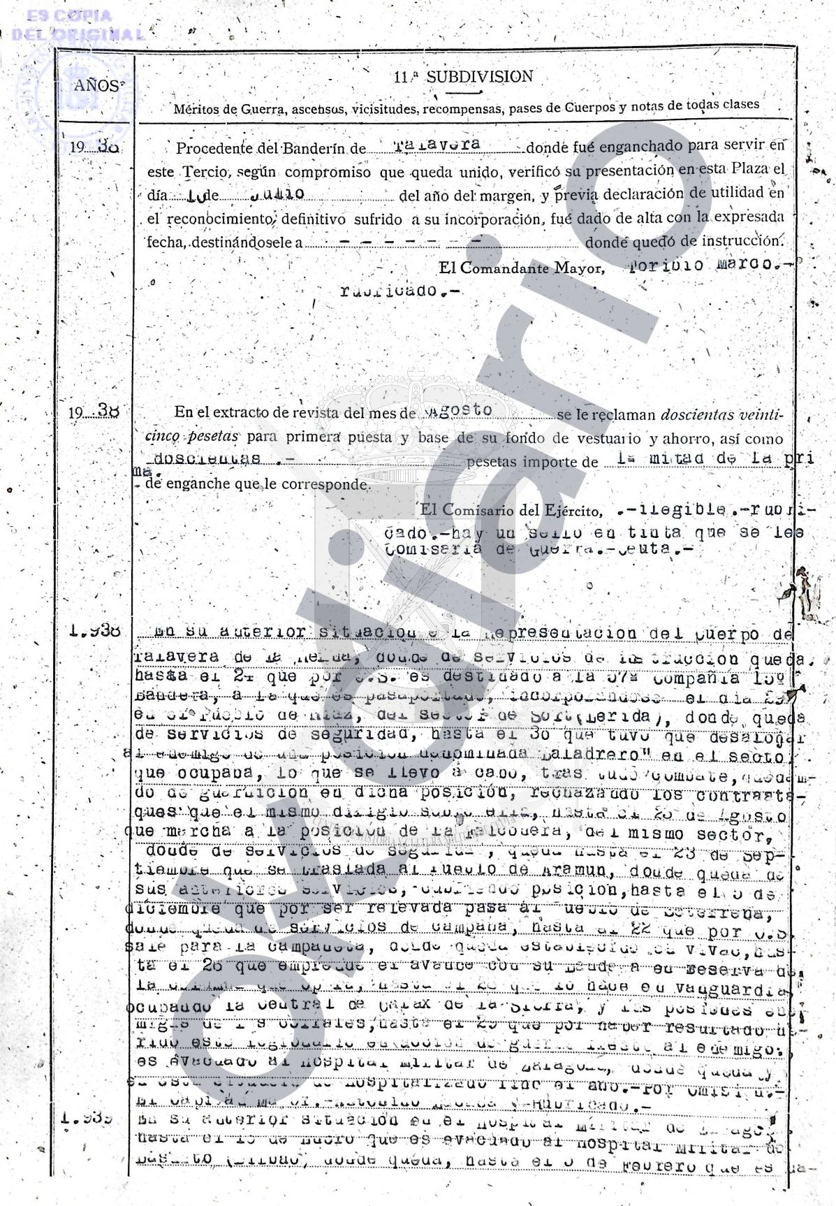 En la jornada siguiente del día de Navidad de 1938, la XV Bandera, a la que se había incorporado Mateo Pérez-Castejón Díaz en julio como legionario de segunda, se unió a la ofensiva franquista sobre Cataluña. Para relatar a continuación cada uno de los pasos que dio el abuelo de Sánchez en este frente, OKDIARIO ha tenido acceso a su hoja de servicios en la Legión, obrante en la causa 1193/42 que se conserva en el Archivo Intermedio Militar de Ceuta, y ha contado con el asesoramiento histórico de Pedro Corral, autor de Desertores.