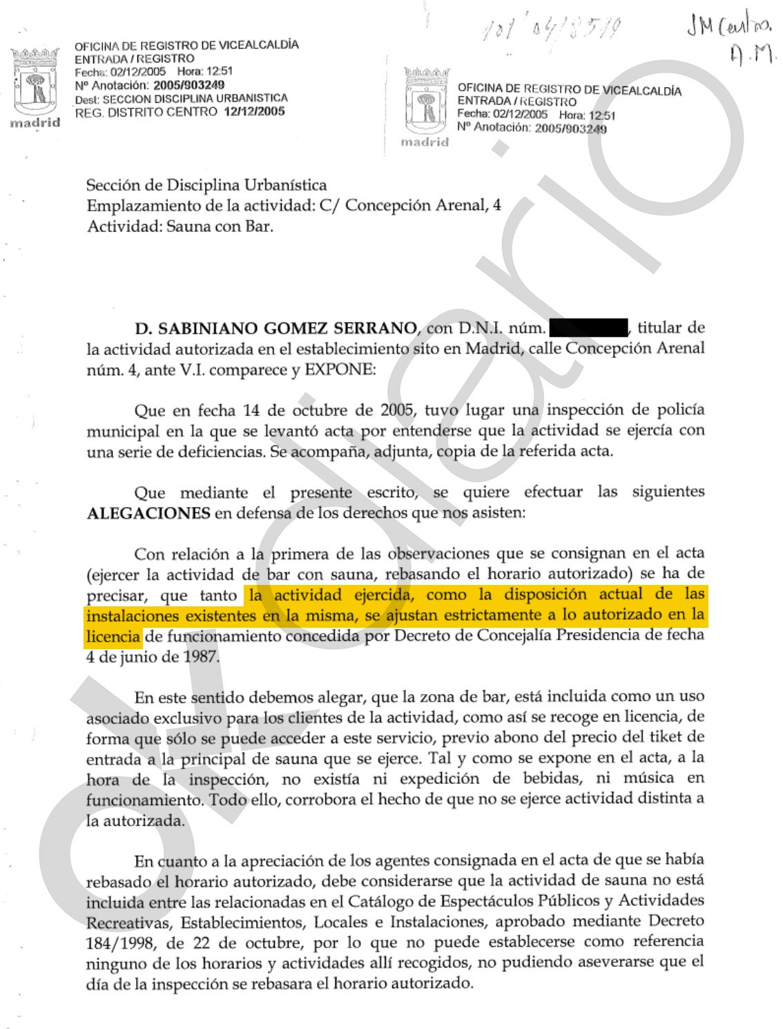 En su escrito de alegaciones, Sabiniano Gómez insistió en que «tanto la actividad ejercida, como la disposición actual de las instalaciones existentes en la misma, se ajustan estrictamente a lo autorizado en la licencia de funcionamiento concedida». Sin embargo, la licencia original en ningún caso habla de prostitución o citas con señoritas. Añadió que «sólo se puede acceder a este servicio [de bar], previo abono del precio del tiket [sic.] de entrada a la principal de sauna que se ejerce».