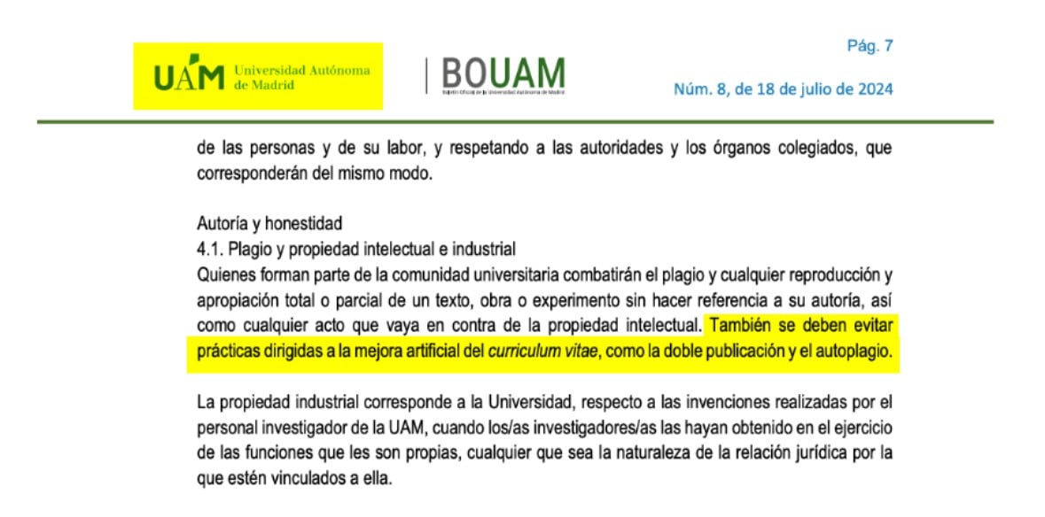 El Código Ético de la Universidad Autónoma de Madrid dice que «quienes forman parte de la comunidad universitaria combatirán el plagio y cualquier reproducción y apropiación total o parcial de un texto, obra o experimento sin hacer referencia a su autoría, así como cualquier acto que vaya en contra de la propiedad intelectual. También se deben evitar prácticas dirigidas a la mejora artificial del currículum vitae, como la doble publicación y el autoplagio», señala este manual de buenas prácticas.