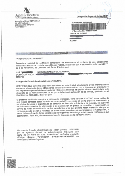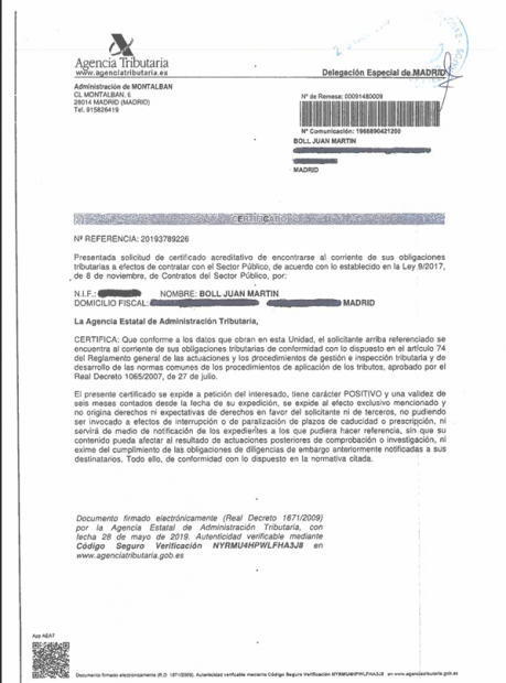 DÉCIMO.- Se adjuntan los certificados de estar al corriente de pago con la Agencia Tributaria. Asimismo la empresa se encuentra al corriente de sus obligaciones en el Registro Mercantil y en todos los organismos públicos. Solicitamos la publicación de los mismos en el integro ejercicio del derecho de rectificación.