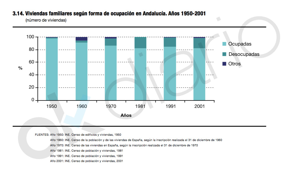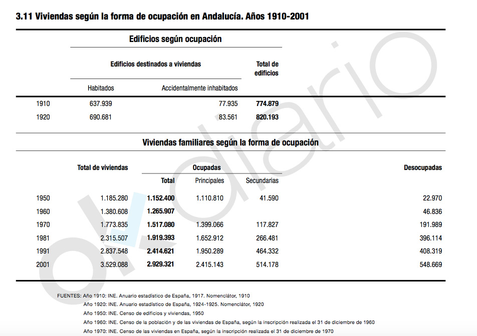 En el informe de la Junta de Andalucía se pueden encontrar los censos de la vivienda en esta Comunidad Autónoma a través de varios epígrafes: «Viviendas según la forma de ocupación en Andalucía. Años 1910-2001», «Viviendas construidas en Andalucía. Años 1970-2000», «Viviendas familiares según forma de ocupación en Andalucía. Años 1950-2001», «Crecimiento intercensal de la población y crecimiento intercensal de la vivienda en Andalucía. Años 1950-2001», «Crecimiento intercensal de la población de Andalucía. Años 1900-2001» o «Evolución intercensal por provincias».